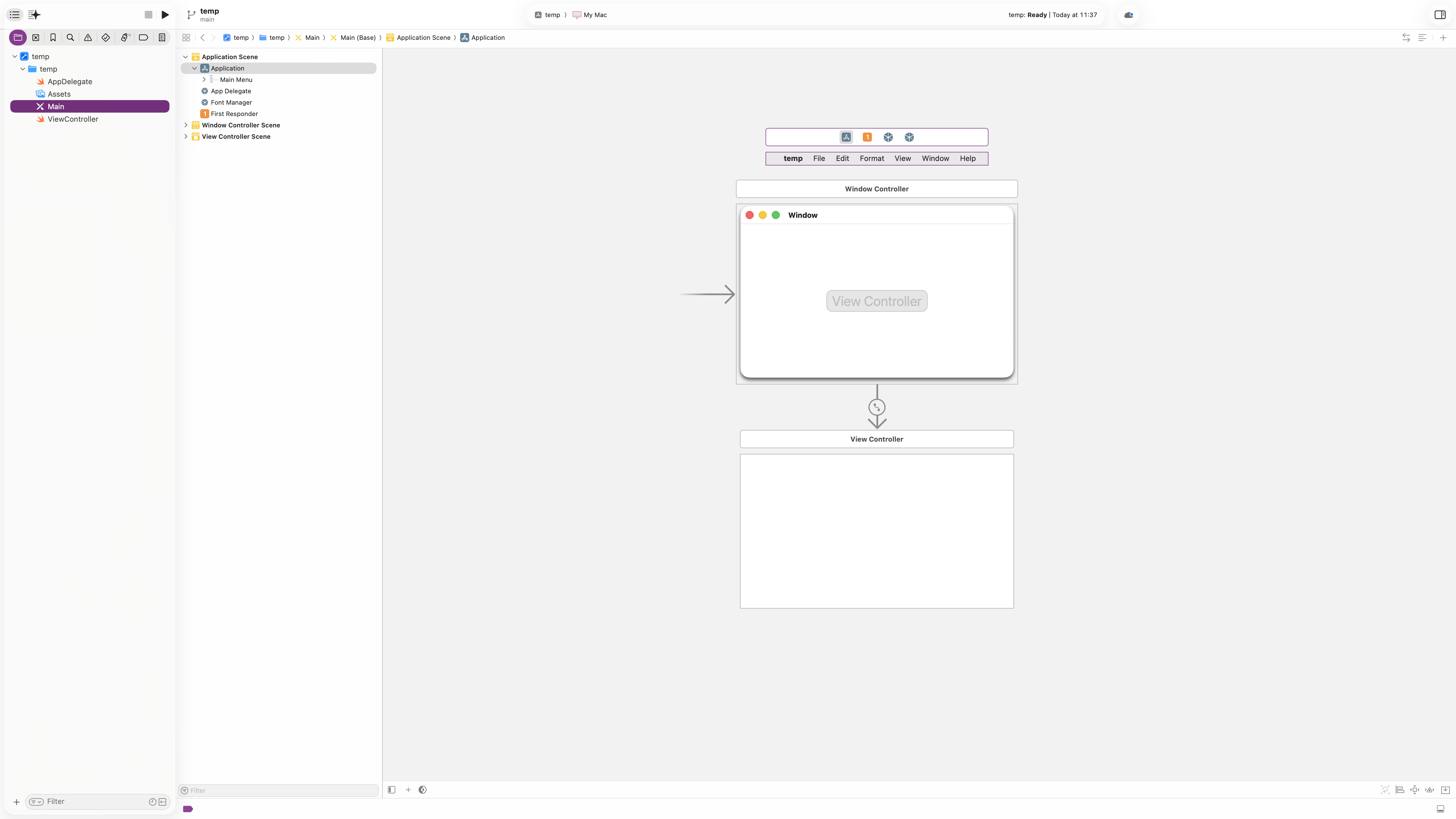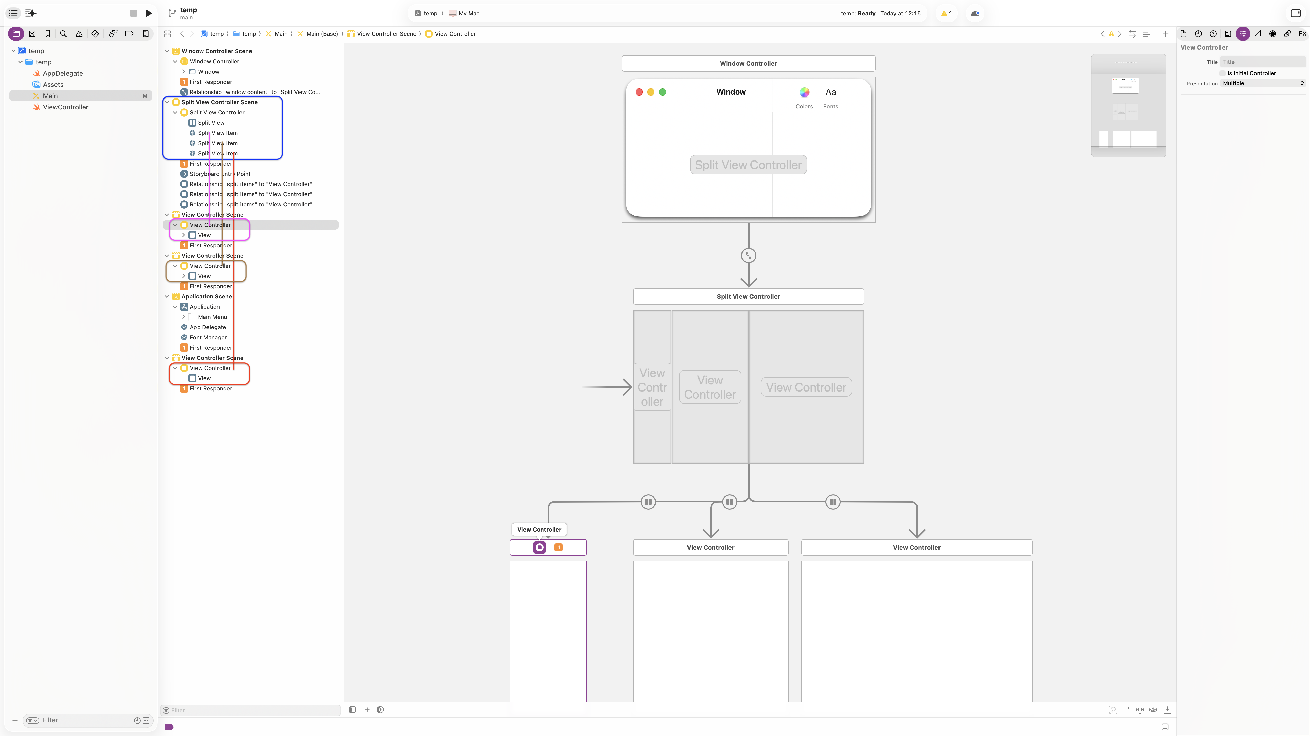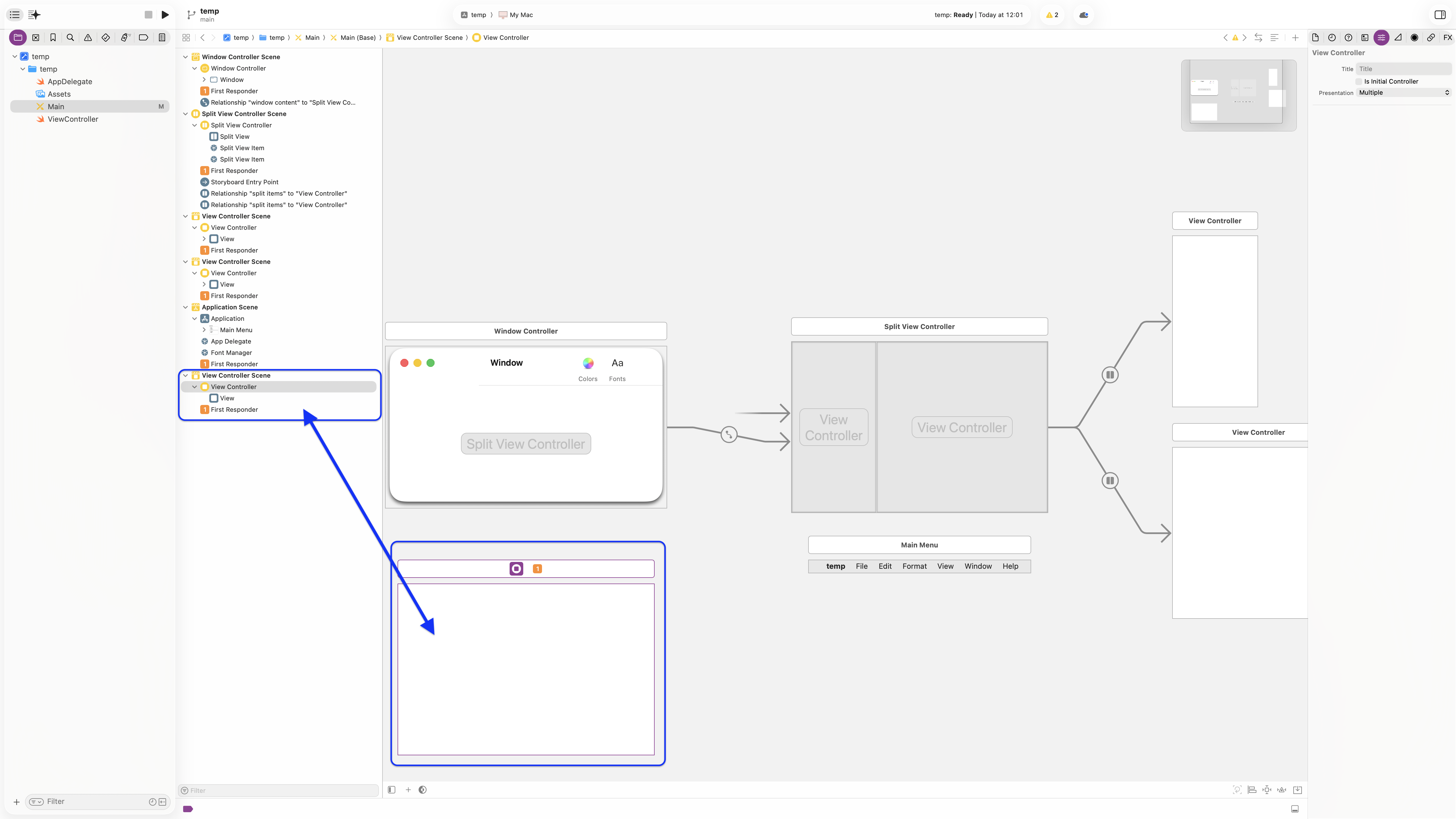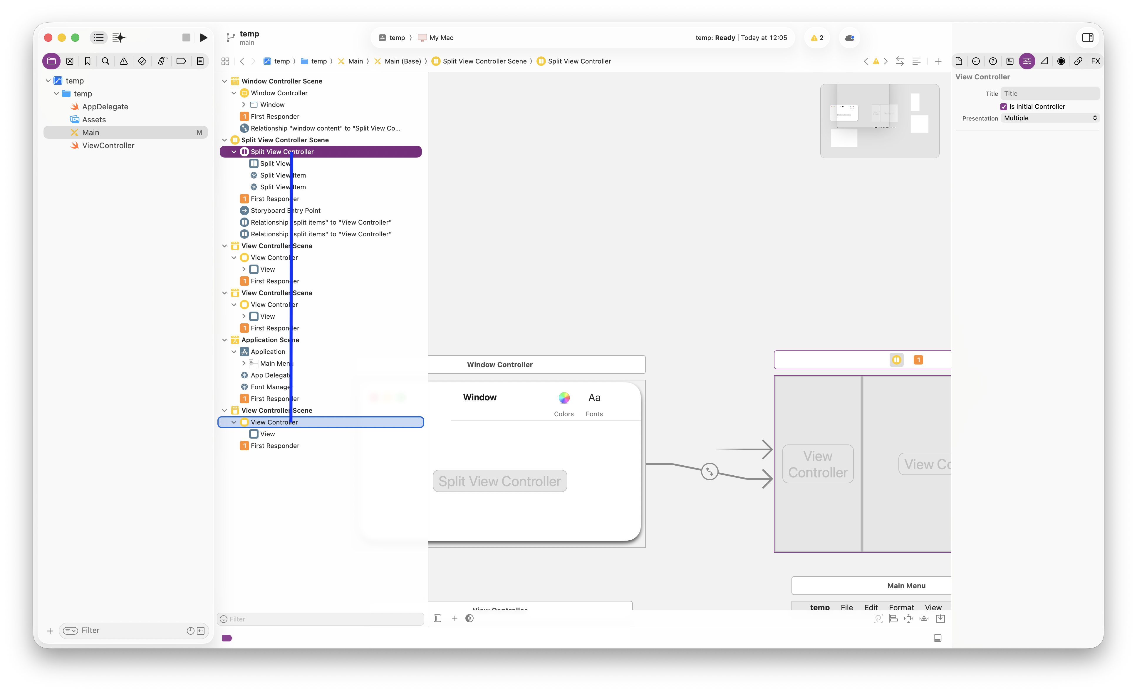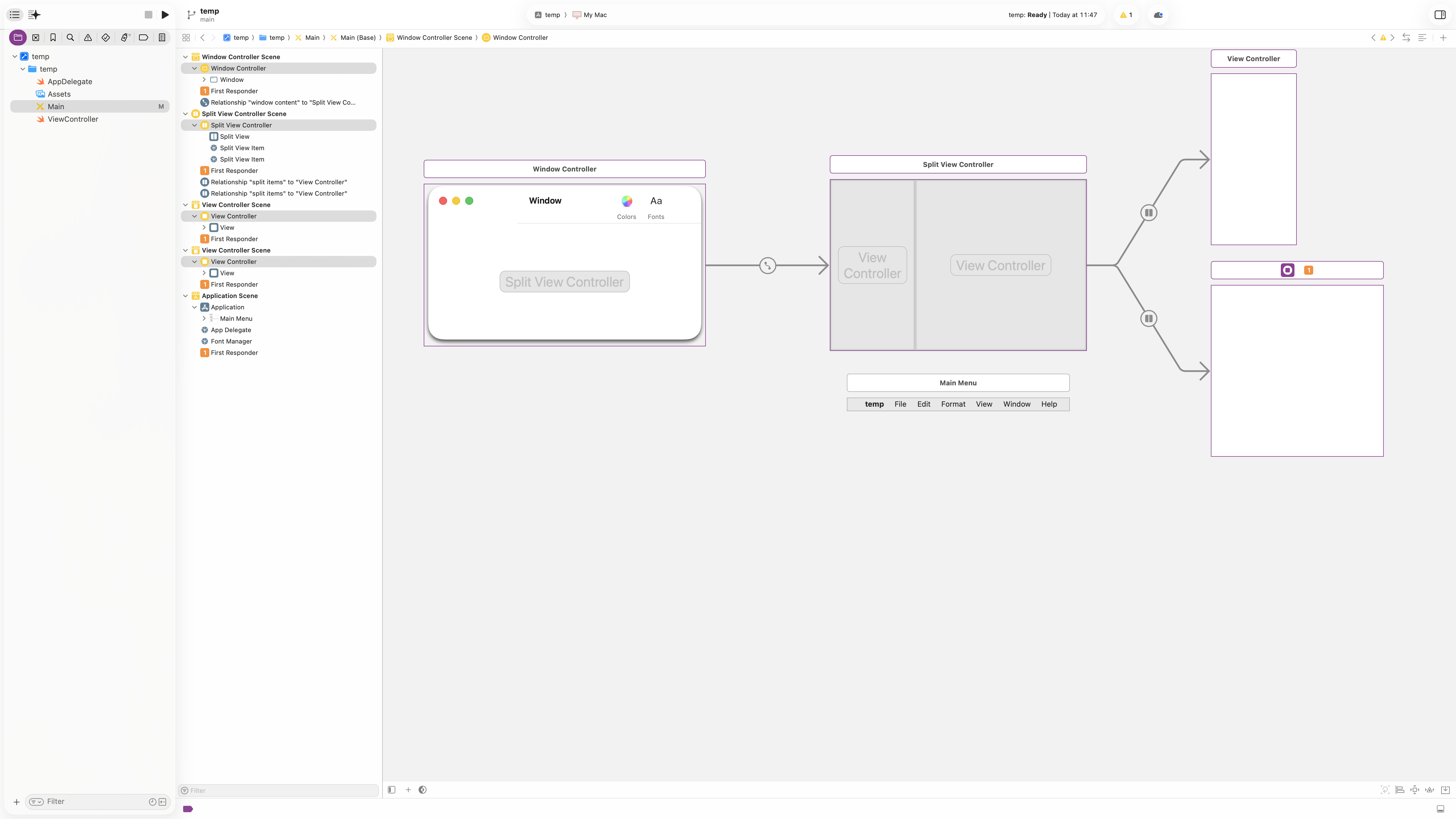 This is the default main storyboard layout in Xcode 26. To add a three-way NSplitViewController so that there are three panes visible on macOS, I fiest deleted the: