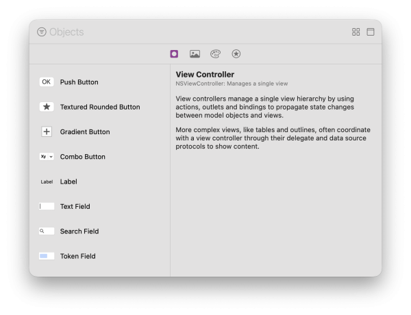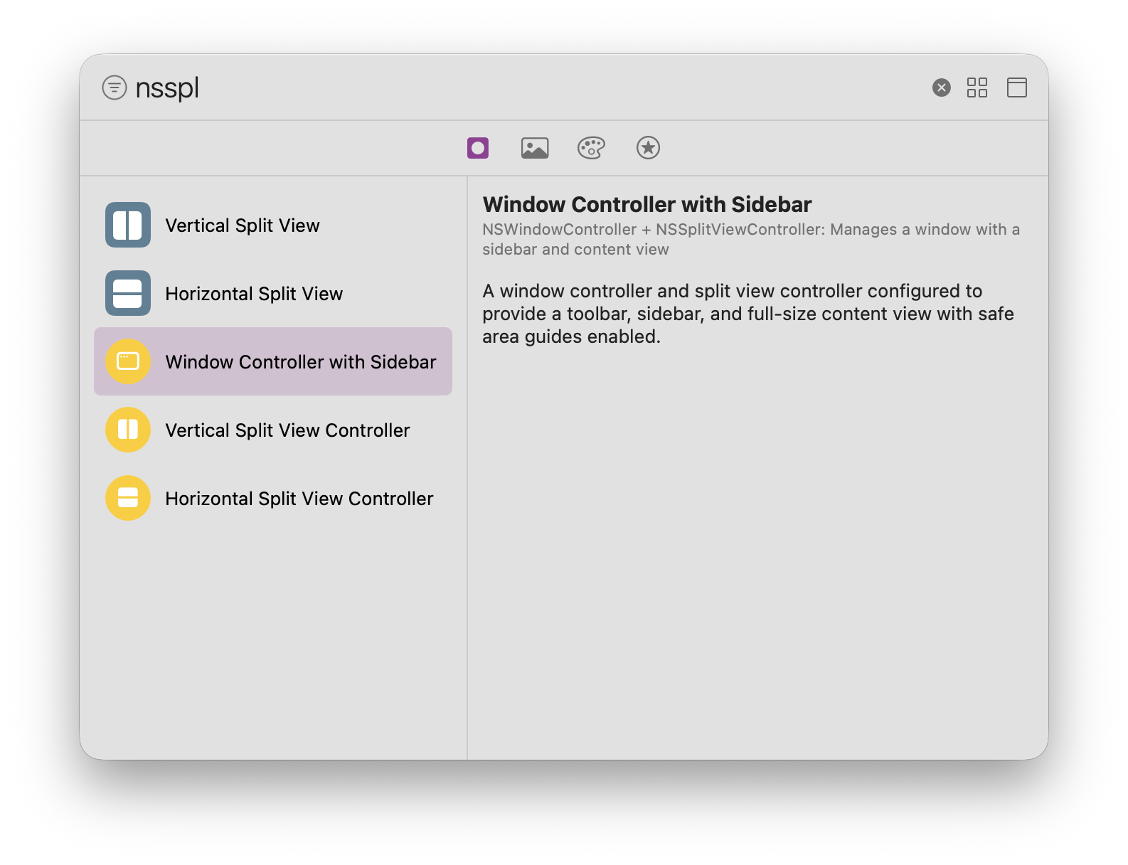 Then use the Show Library command (Menu: View/Show Library or click the + character in the bottom toolbar on the RHS. Search for NSSplitViewController as shown …