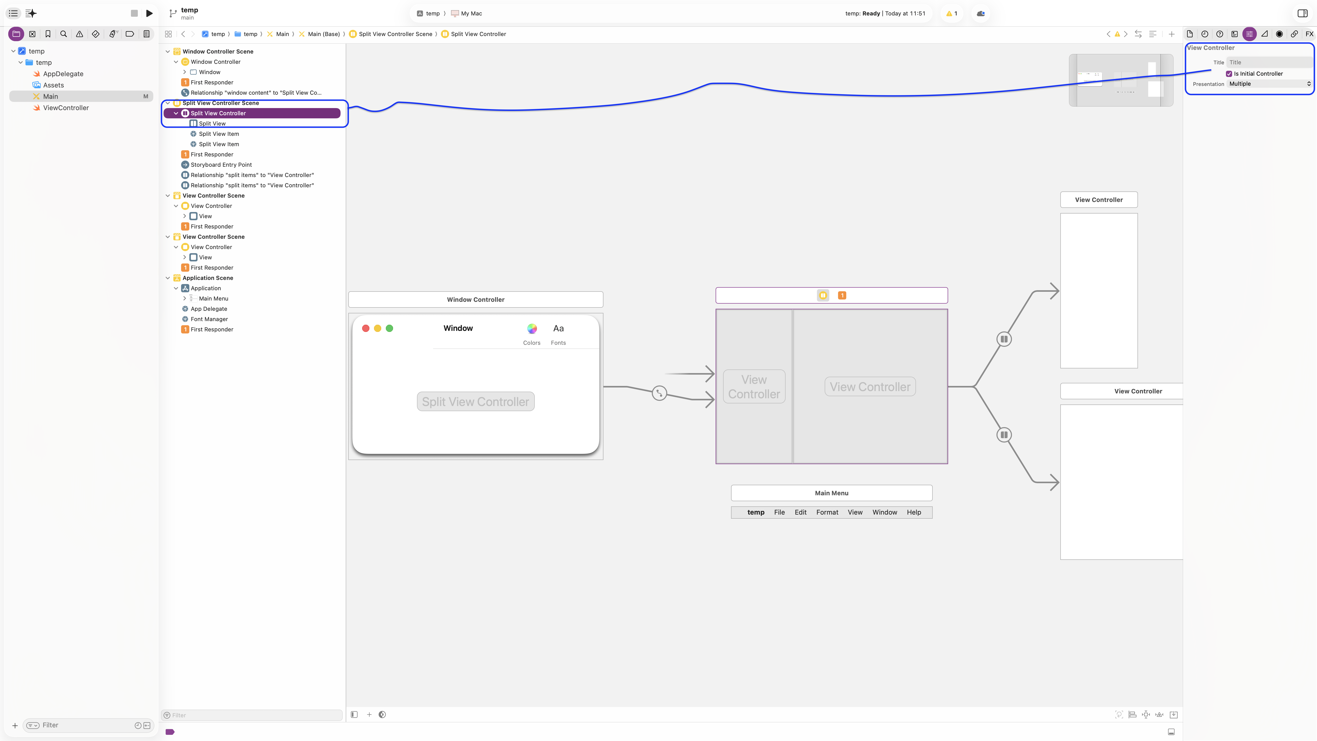 Next, ensure that the Split View Controller is selected in the Document Outline. Then ensure that the Attributes Inspector is visible by clicking on the Hide or Show the Inspectors icon at the top right. The check the flag Is Initial Controller as shown: